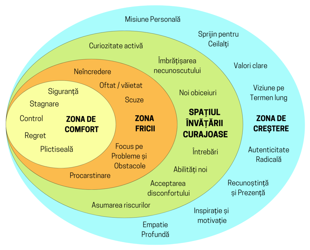 Frica este gardianul de serviciu al zonei de confort. Ea șoptește în ureche: „Nu ești pregătit”, „Ce vor spune ceilalți?”, „Mai bine stai aici, unde e sigur.” Așa ajungem în zona fricii, un cocoon plin de scuze, victimizare și procrastinare, lipsiți de încredere și cu un focus exagerat pe probleme. Ne agățăm de povești vechi și evităm orice ne-ar scoate din tipare.